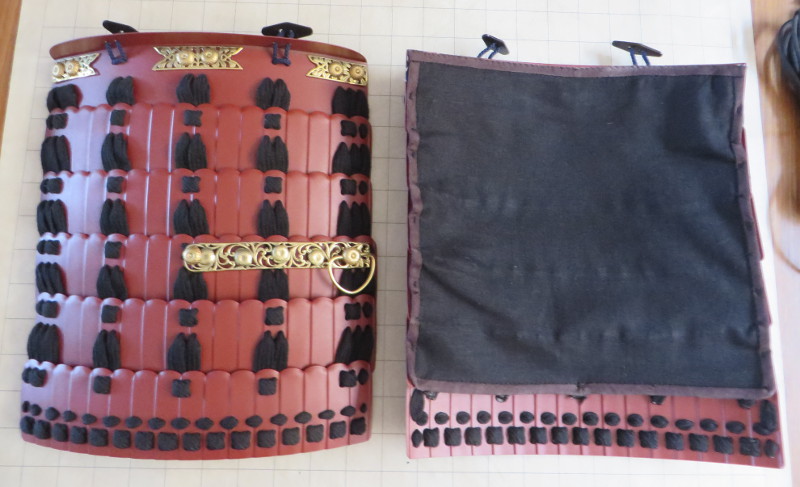 La partie inférieure du plastron est presque toujours accompagnée de Kusazuri, des plaques de métal attachées entre elles par des cordons et formant une jupe protégeant le bassin.